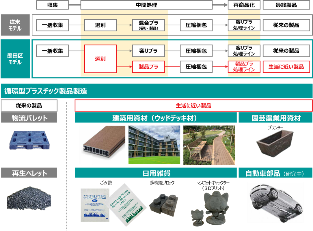 墨田区の再商品化計画の最大の特徴は、区が家庭から一括回収したプラスチック資源を中間処理施設にて「プラスチック製容器包装」と「製品プラスチック」に選別することで、高品質な原料作りと環境負荷の低減、効率的なリサイクルを実現する点にあります。特に、「製品プラスチック」という単一素材で硬質な素材をそのまま活かすことで、より区民生活に還元できる製品や産業界で開発・製造される高度なプラスチック製品の原料となり、これまで以上に高品質なプラスチックリサイクルが可能となります。