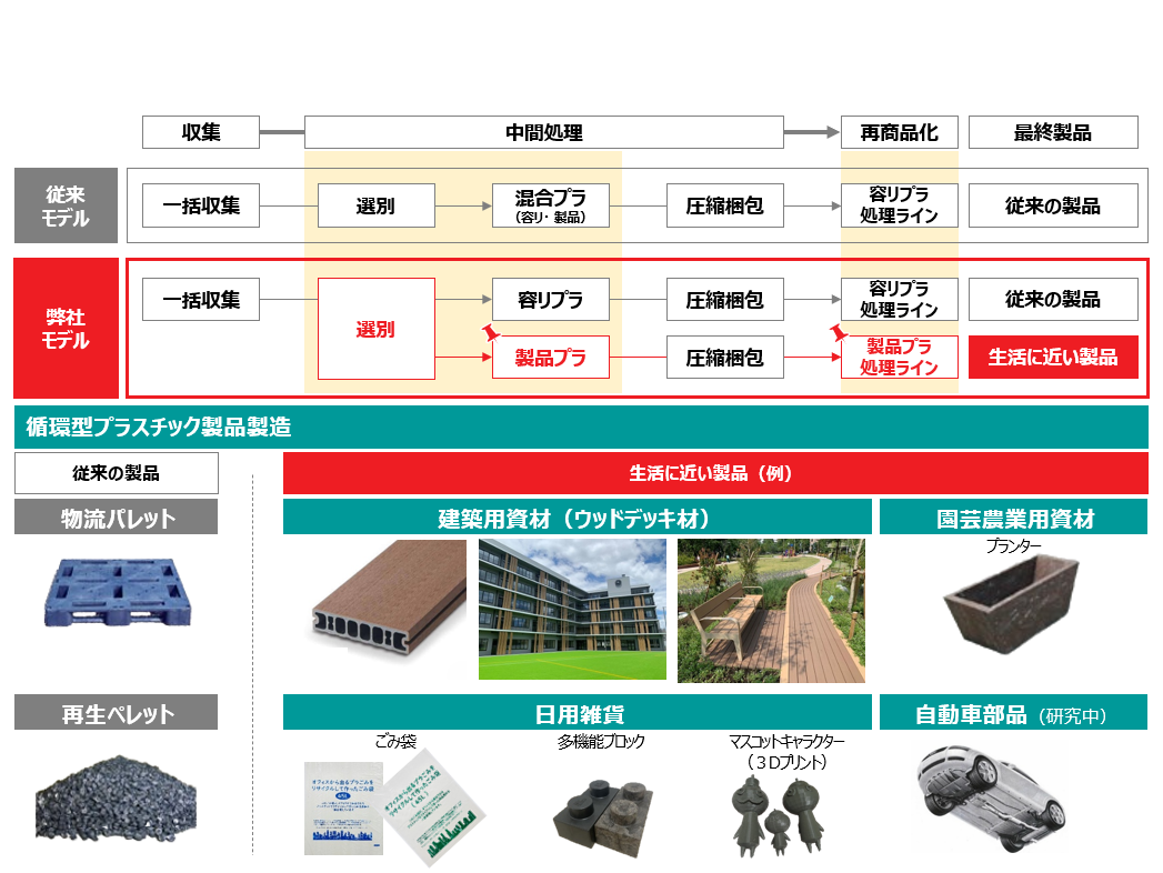 墨田区の再商品化計画の最大の特徴は、区が家庭から一括回収したプラスチック資源を中間処理施設にて「プラスチック製容器包装」と「製品プラスチック」に選別することで、高品質な原料作りと環境負荷の低減、効率的なリサイクルを実現する点にあります。特に、「製品プラスチック」という単一素材で硬質な素材をそのまま活かすことで、より区民生活に還元できる製品や産業界で開発・製造される高度なプラスチック製品の原料となり、これまで以上に高品質なプラスチックリサイクルが可能となります。